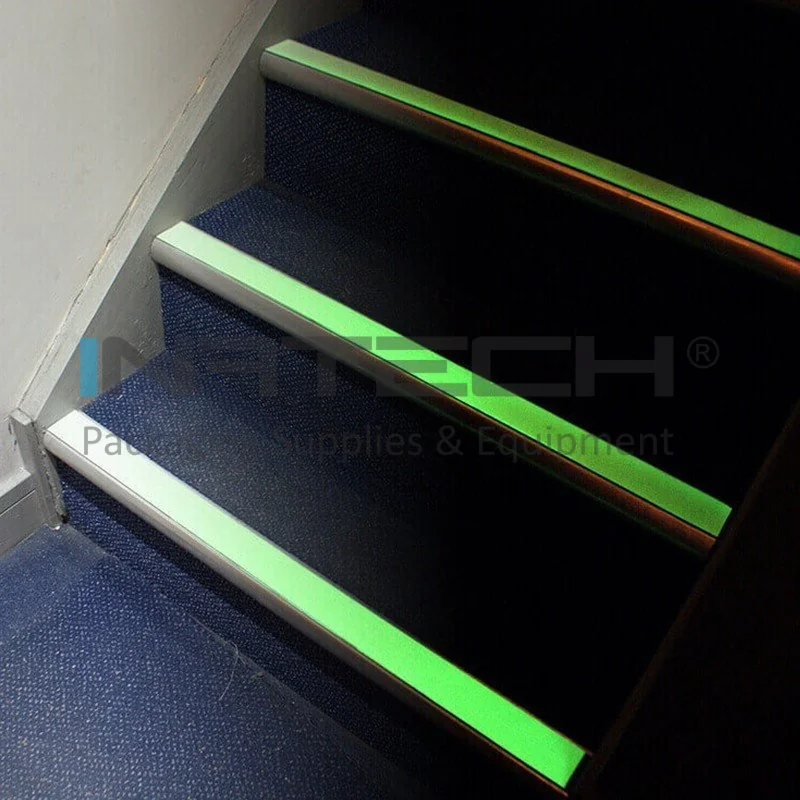 In timpul zilei, banda adeziva fluorescenta are o nuanta usor verde, iar in intuneric emite o lumina alba stralucitoare. Poate fi incarcata fie de surse de lumina naturale, fie de surse de lumina artificiala. Durata emisiei de lumina variaza in functie de cantitatea de lumina primita. De obicei se consuma intr-o perioada de cateva ore. Nu contine niciun produs radioactiv, deci poate fi utilizata in multe medii. Alegerea culorii este fie simpla, fie nuantata.