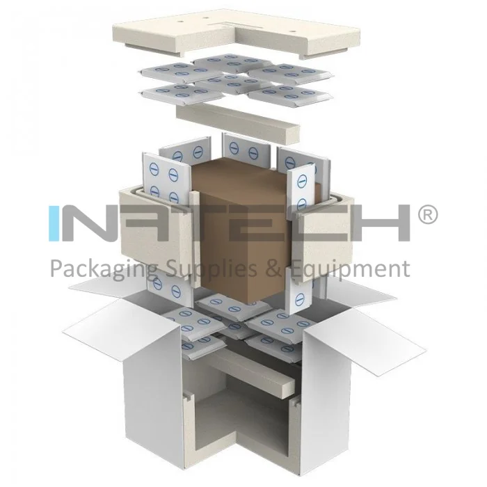 Sistemul este compus din: cutie carton exterior, cutie polistiren, cutie carton interna pentru produse si rezerve pentru racire PCM (material cu schimbare de faza) -21°C din spuma.