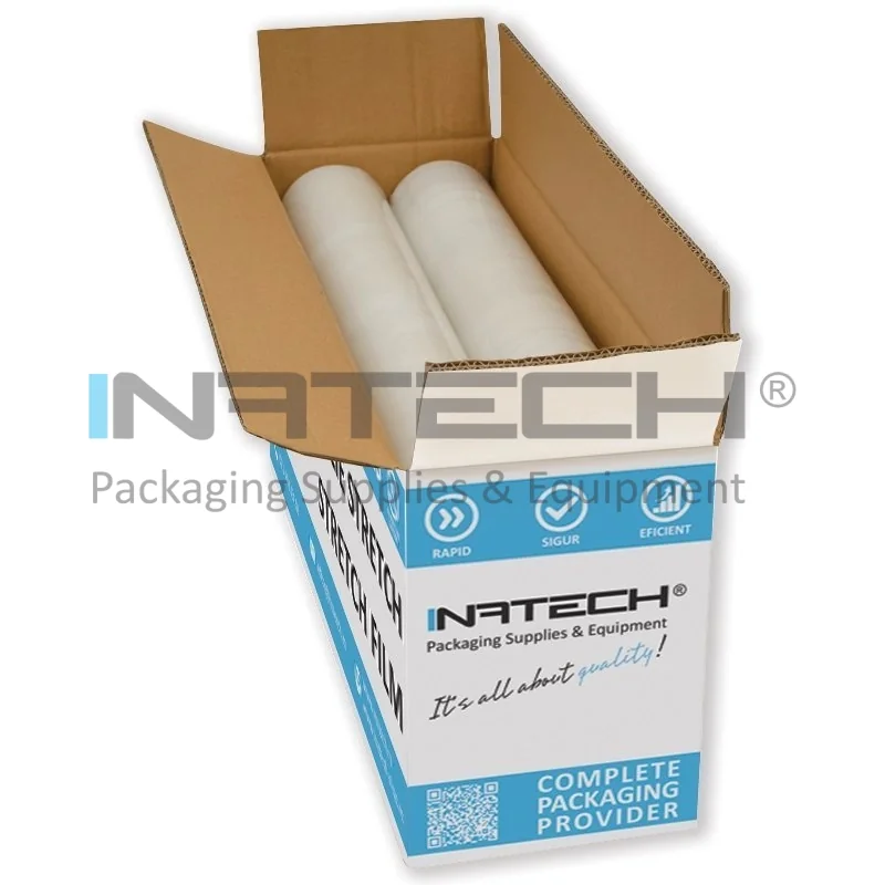 Folia stretch pentru uz manual este livrata sub forma de role ambalate cate 6 buc in cutie de carton.