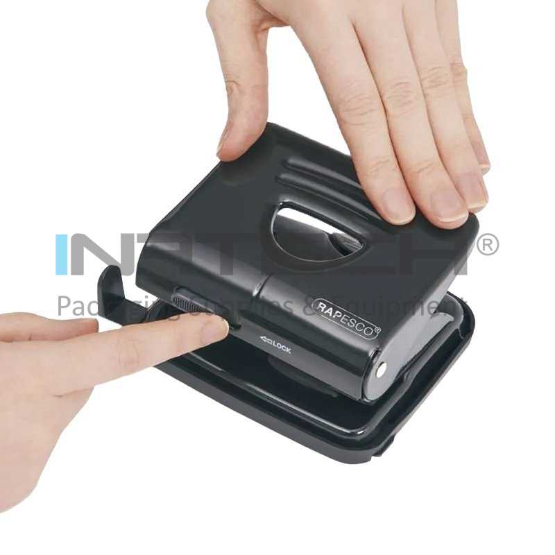 Un alt avantaj al perforatorului Rapesco este manerul pentru blocare, care faciliteaza depozitarea acestuia atunci cand nu este utilizat, economisind spatiu pe birou. Fereastra de personalizare ajuta la identificarea rapida a produsului, iar rigla de ghidaj ajustabila permite o perforare exacta, potrivita pentru diferite dimensiuni de hartie.