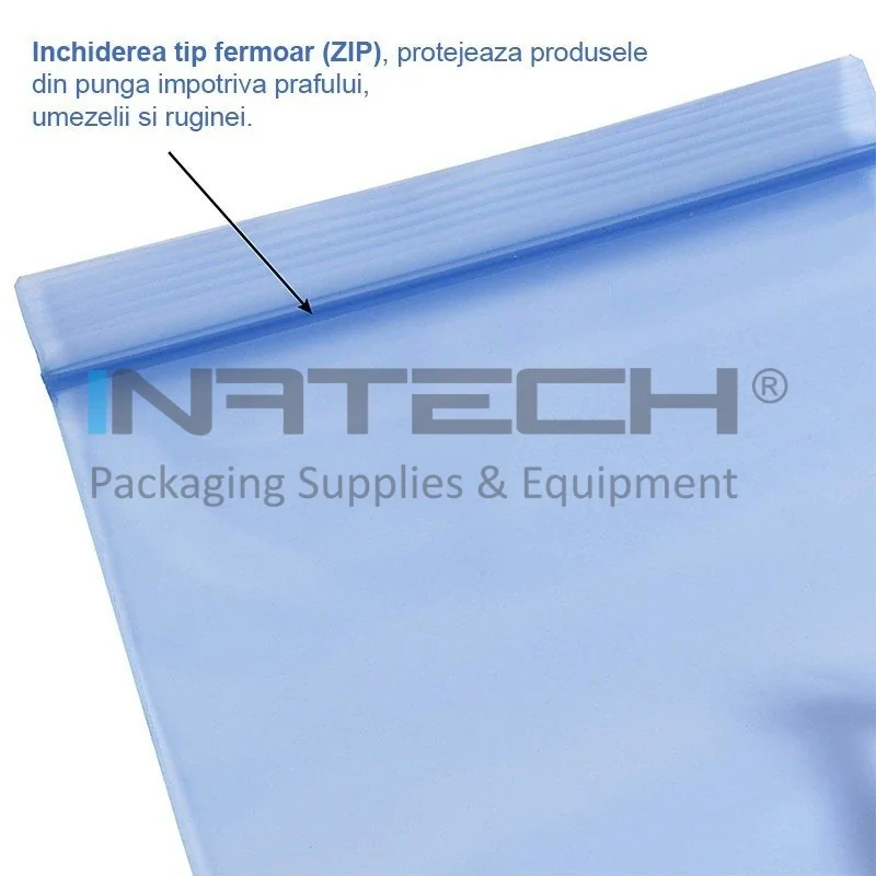 Punga Anticoroziva Cu Fermoar asigura protectia impotriva oxidarii metalelor, prin crearea pe suprafata metalului a unui strat de protectie. Datorita aditivului anticoroziune adaugat direct in produs, ambalarea in pungile VCI ZIP are proprietatea de a proteja eficient produsele de coroziune. Aditivul se degaja treptat, formand o pelicula protectoare ce ajunge in toate cavitatiile sau locurile greu accesibile.